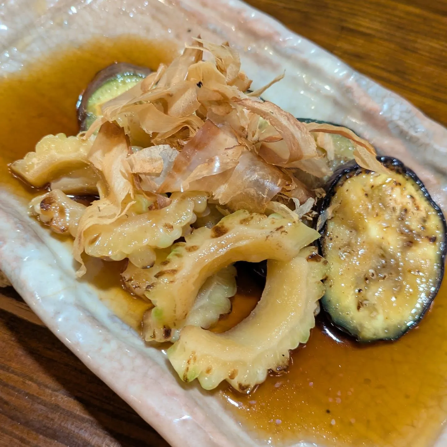 こんばんは! 2025/09/08 こんばんは! 神保町トンちゃんです🐷 今週も始まりました。よろしくお願いします。 本日は白ゴーヤと茄子の焼き浸しです。白ゴーヤは苦味がマイルドでとても食べやすいです。香ばしく焼いたゴーヤと茄子が出汁によく馴染みました。冷たいままお召し上がり下さい‼️ #神保町ディナー #神保町やきとん #神保町居酒屋 #神保町もつ焼き #神保町ごはん #白ゴーヤ